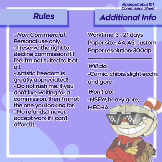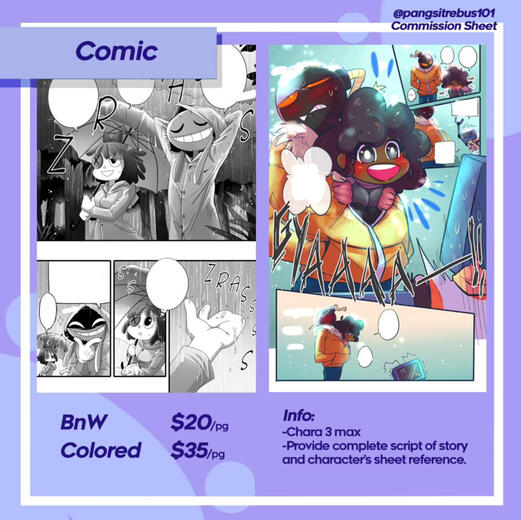 For Comic/Pages Commission, please send out a complete script of story (setting/place, conversations, characters references, and/or other additional info such as intricate details of some things (jewelry, weapons, etc)) and emotions the characters/settings in; such as angst, wholesome, morbid, etc. The paper size for Comic/Page commission is A5 (1748 x 2480px).